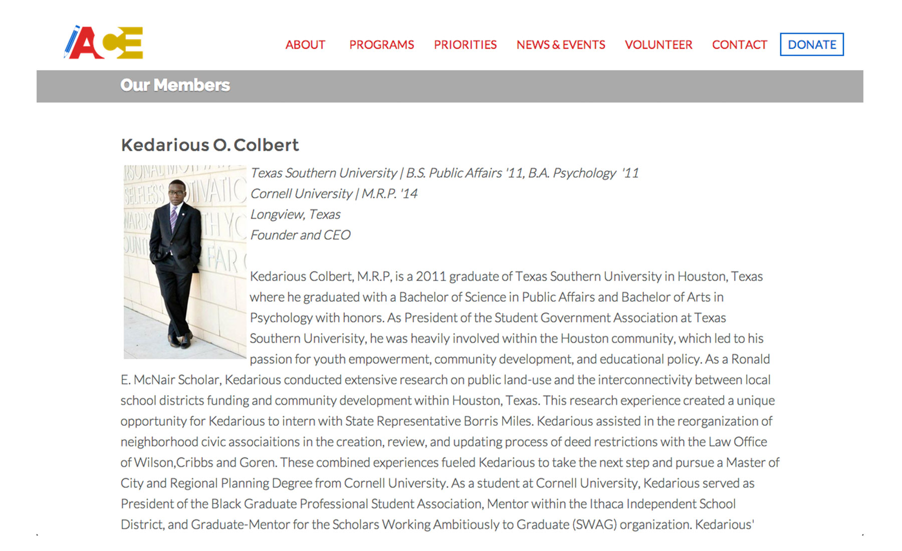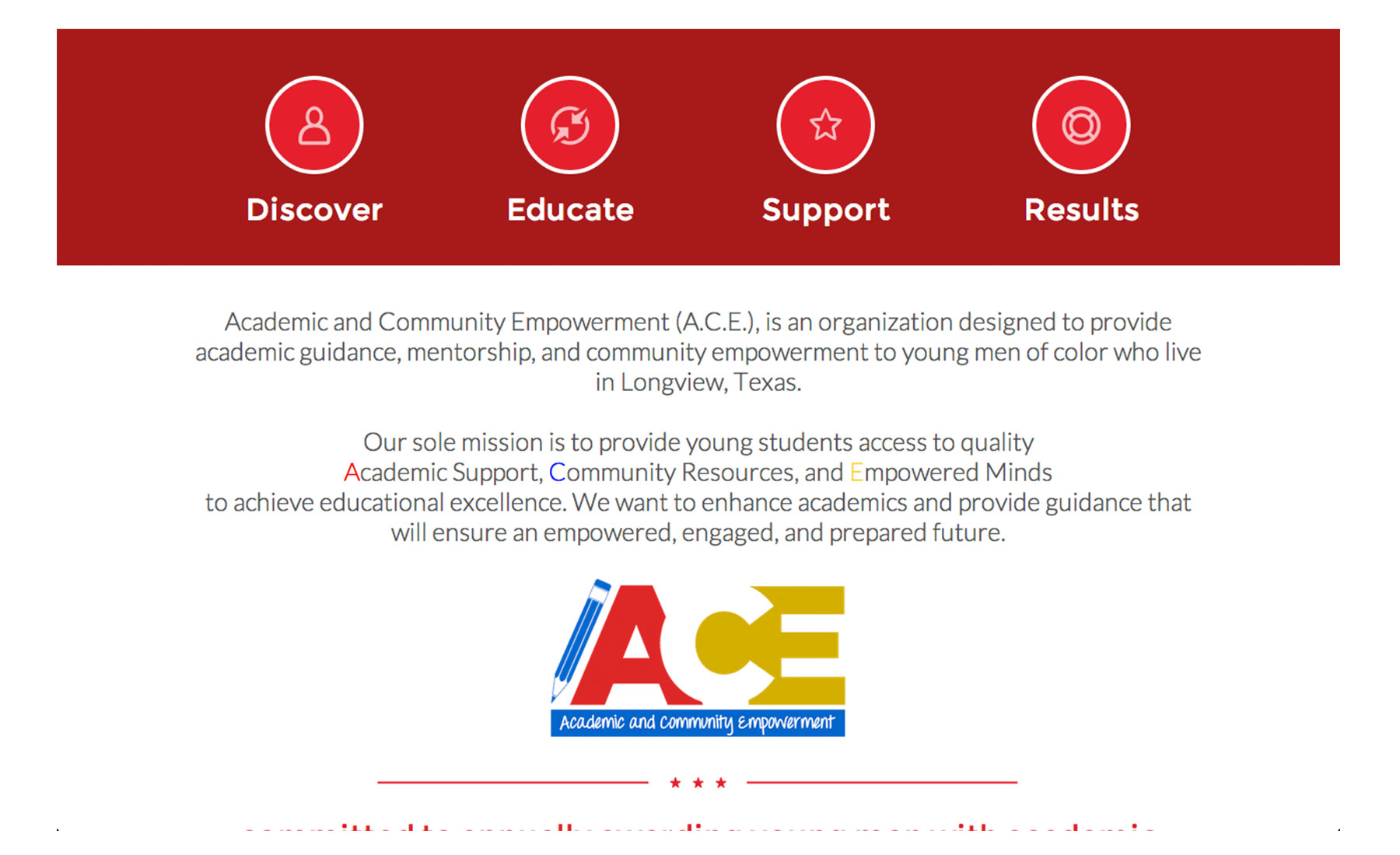 Academic and Community Empowerment (A.C.E.), is an organization designed to provide academic guidance, mentorship, and community empowerment to young men of color who live in Longview, Texas.