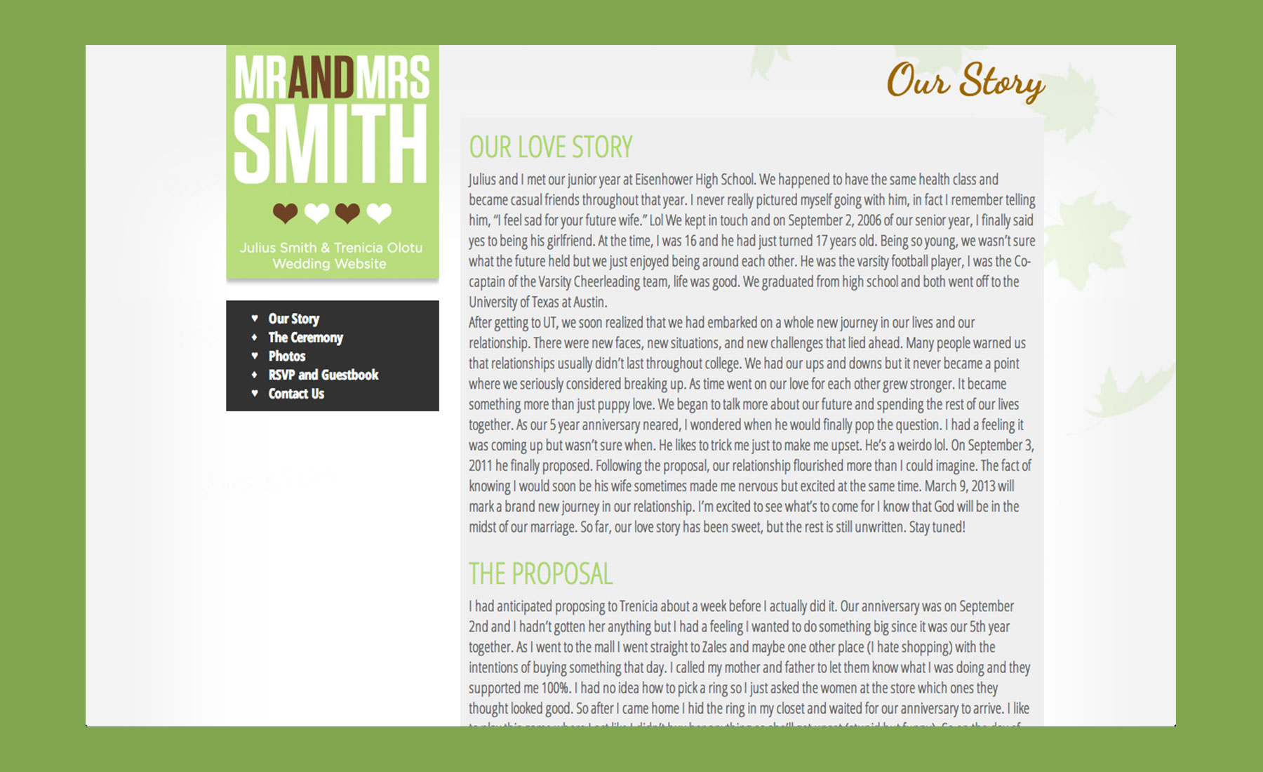 The site portrays the story and love between two, and also allows users to view photos, sign the guestbook, and RSVP. Client has the ability to modify and edit the guestbook / rsvp list.