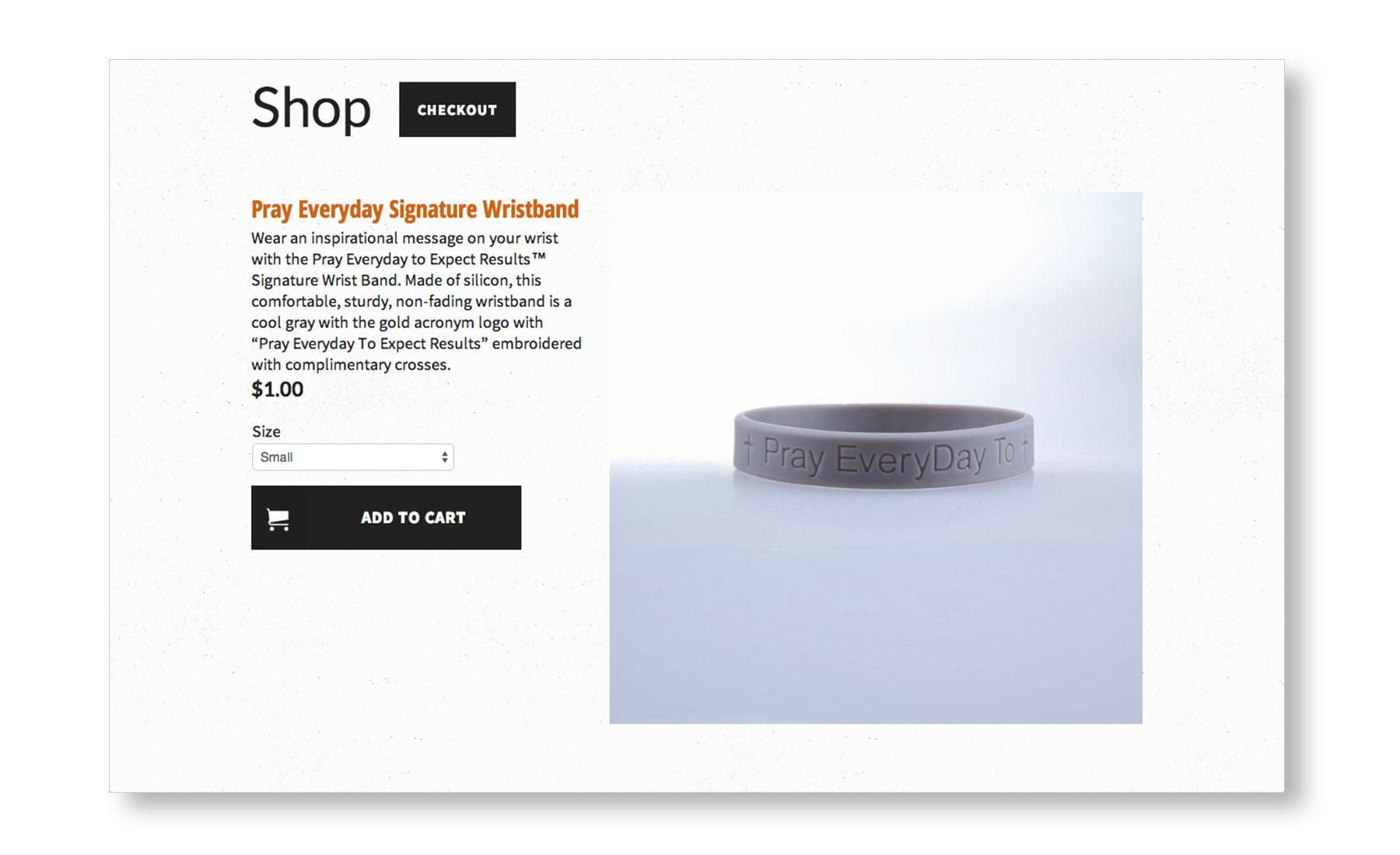 Pray EveryDay To Expect Results is an inspirational brand, with a simple vision of reminding us all that in order to achieve our desired results, we must make sure prayer is apart of our daily routine. The site's core features are the blog and shopping page, which is managed by the client through a custom CMS (Content Management System).