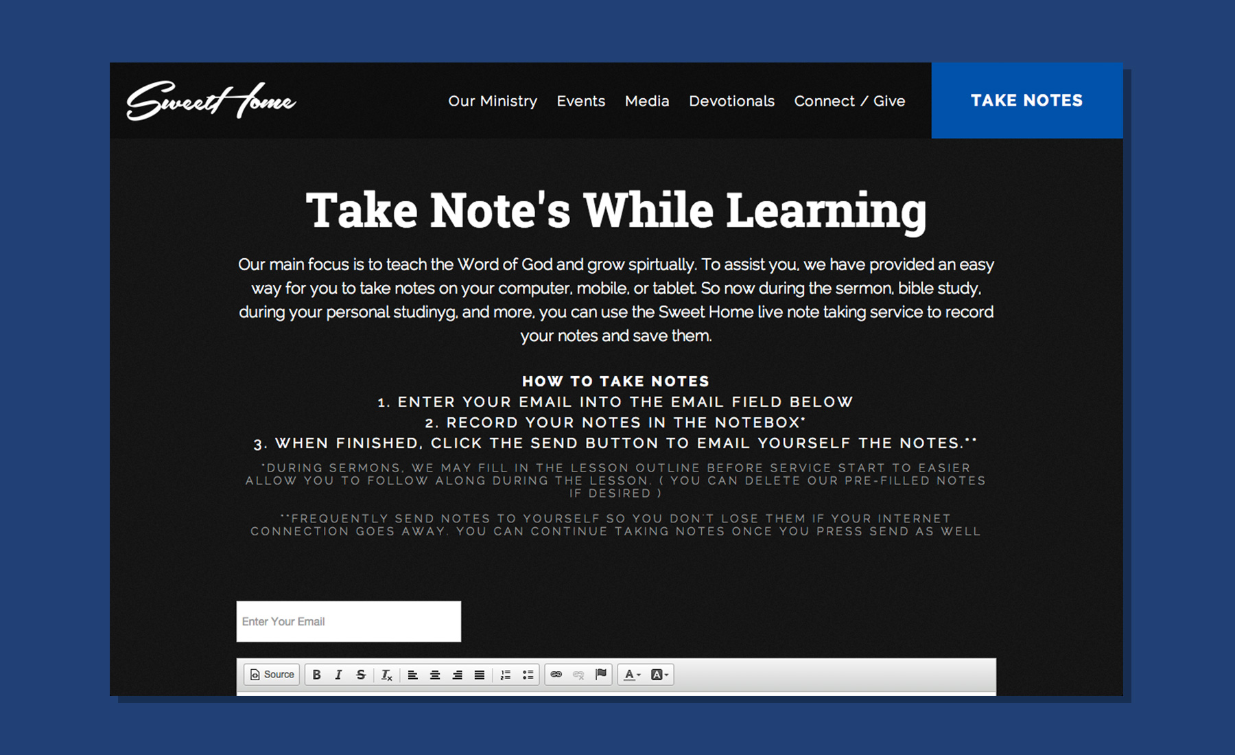 Sweet Home baptist is a church ministry in Fort-Worth, Texas led by Pastro James C. Brown. We worked alongside their media team to create a new website with features for helping the serve their congregation and community better: