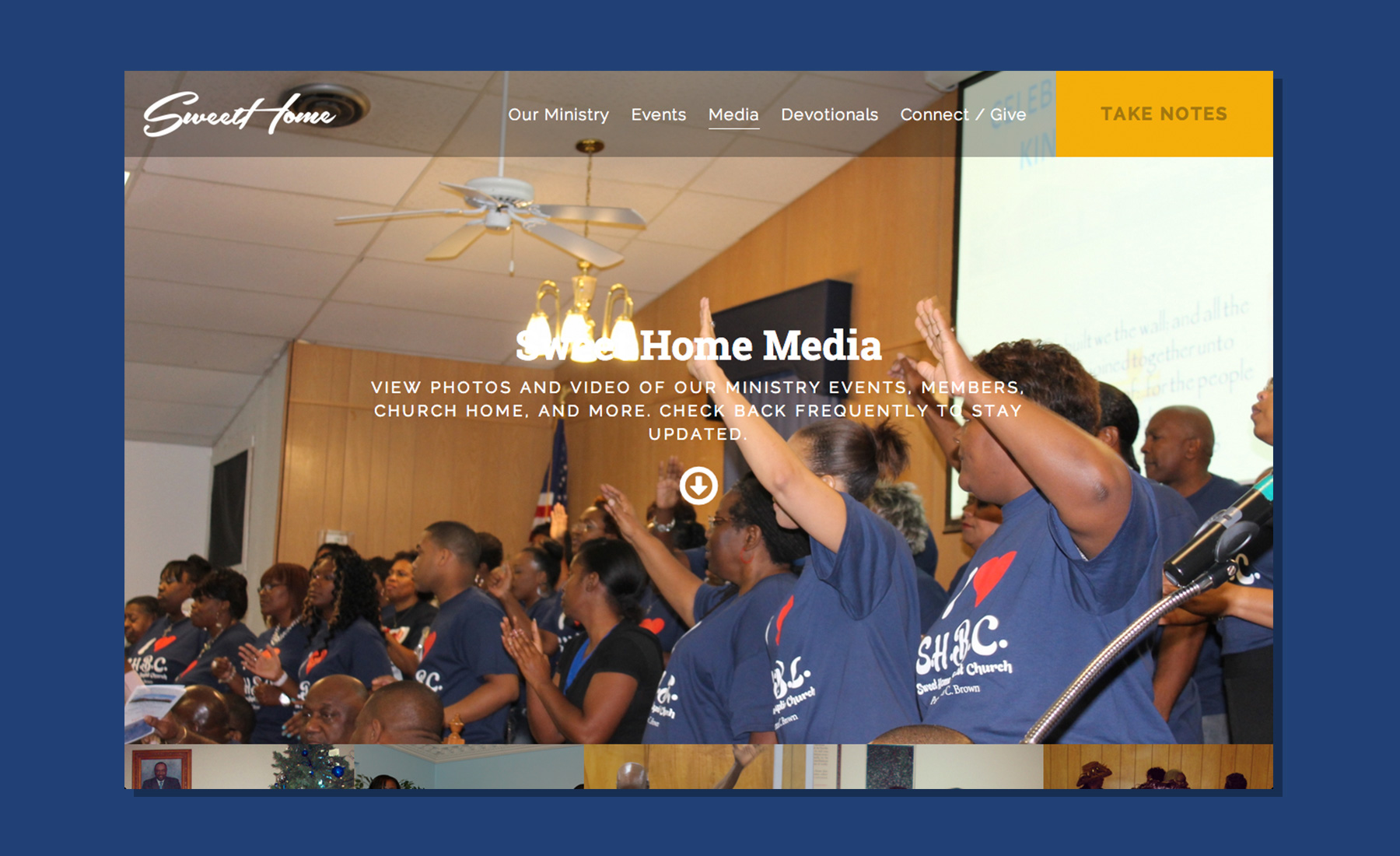 Media page that includes recent photos and videos of ministry activity