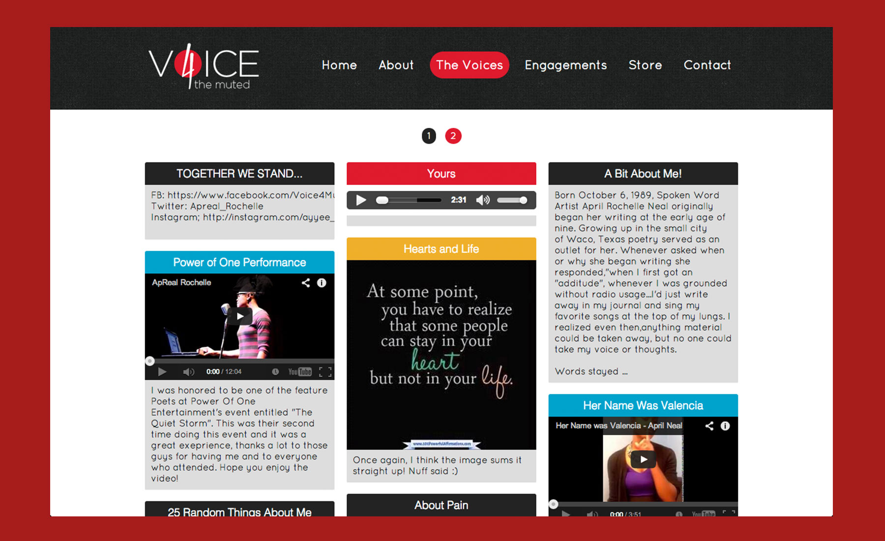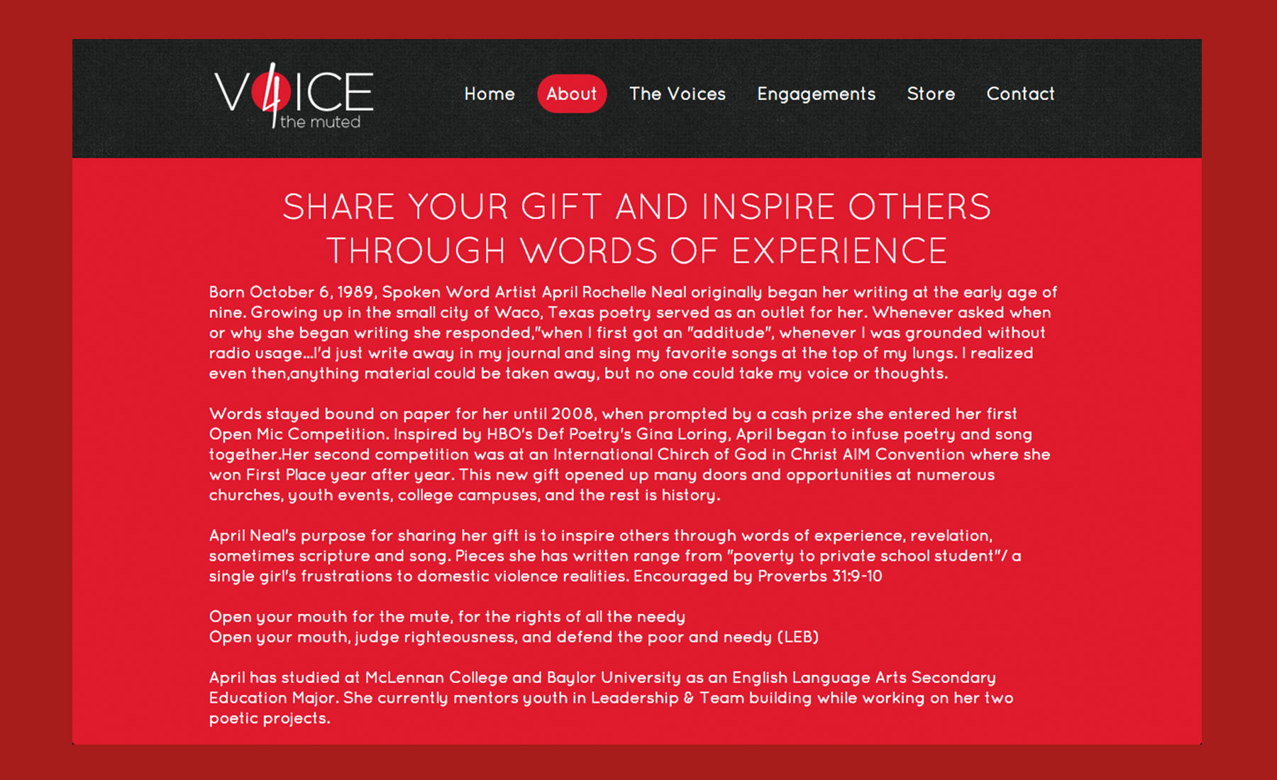 Voice 4 The Muted is an inspirational, motiviating, spoken-word campaign by April Neal. April Neal's purpose for sharing her gift is to inspire others through words of experience, revelation, sometimes scripture and song.